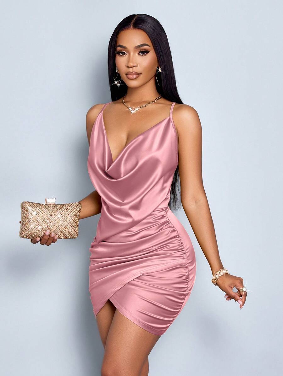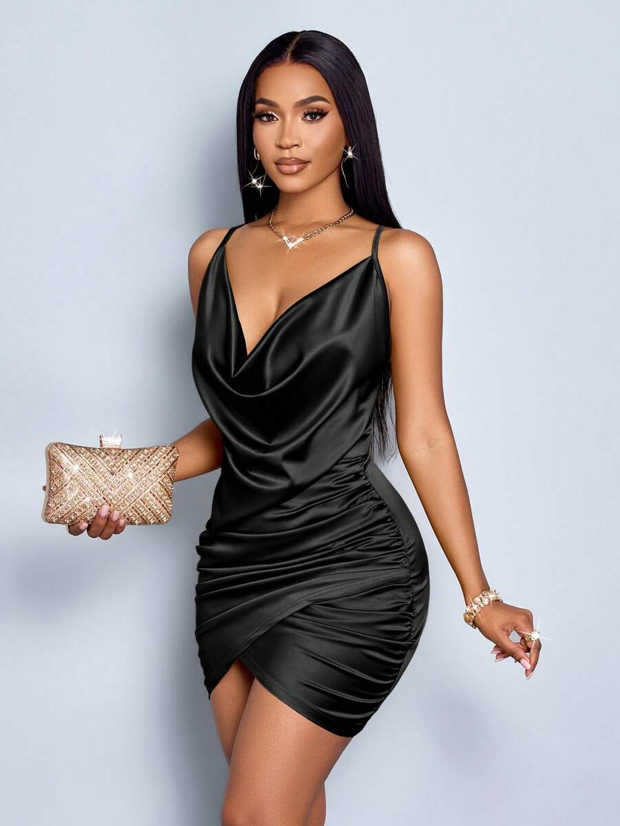 SOLERSUN Elegant Solid Color Draped Collar Backless Ruched Satin Party Bodycon Short Dress