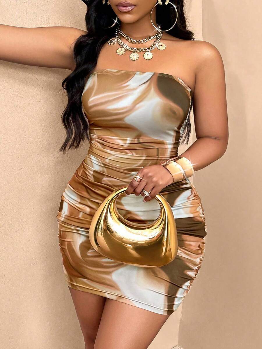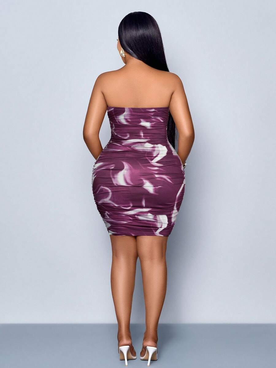 SOLERSUN Plus Size Women Marble Printed Strapless Bodycon Party Dress For Women (Random Floral Print)